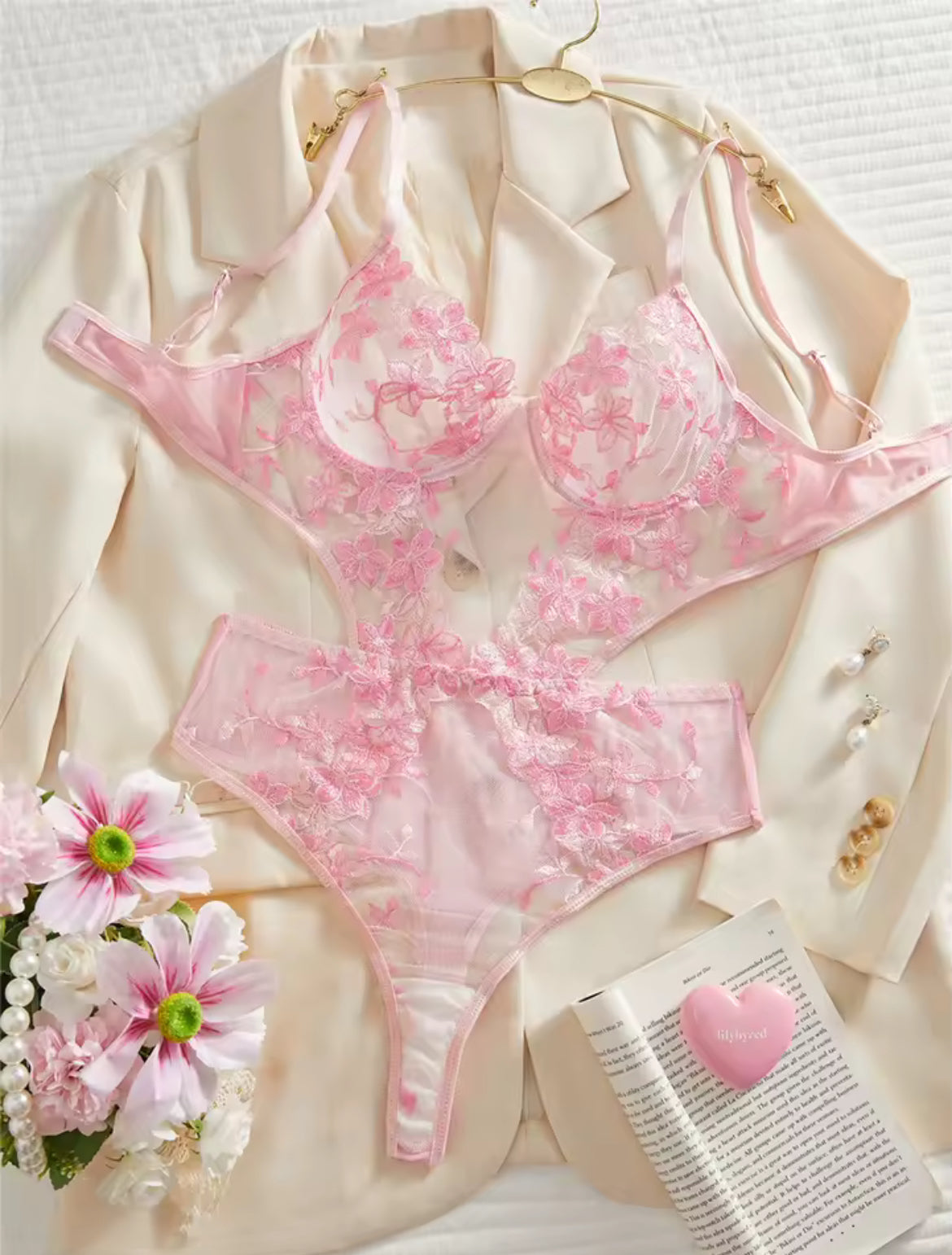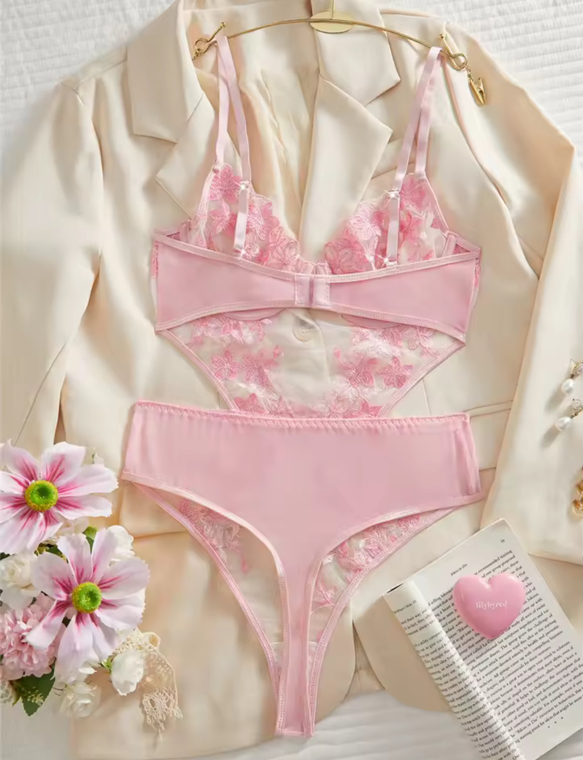 Características: Body de encaje con transparencias y delicado bordado floral; ajustable en tirantes; soporte de aros en el busto; estilo cut-out y broche ajustable en la parte trasera
