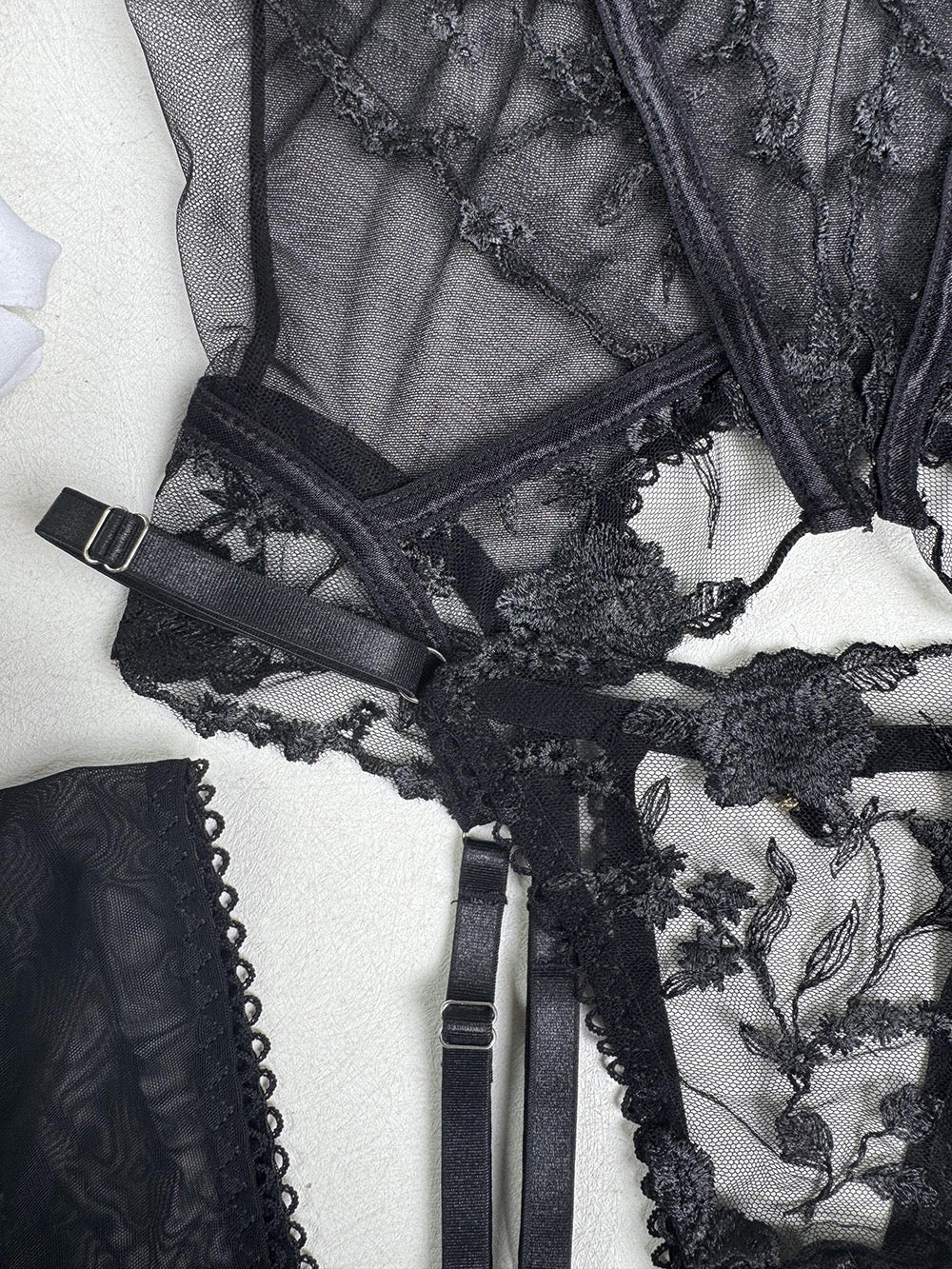 Características: Set con encaje transparente con bordado floral; ligas incluidas; liguero ajustable y ajustable de los tirantes