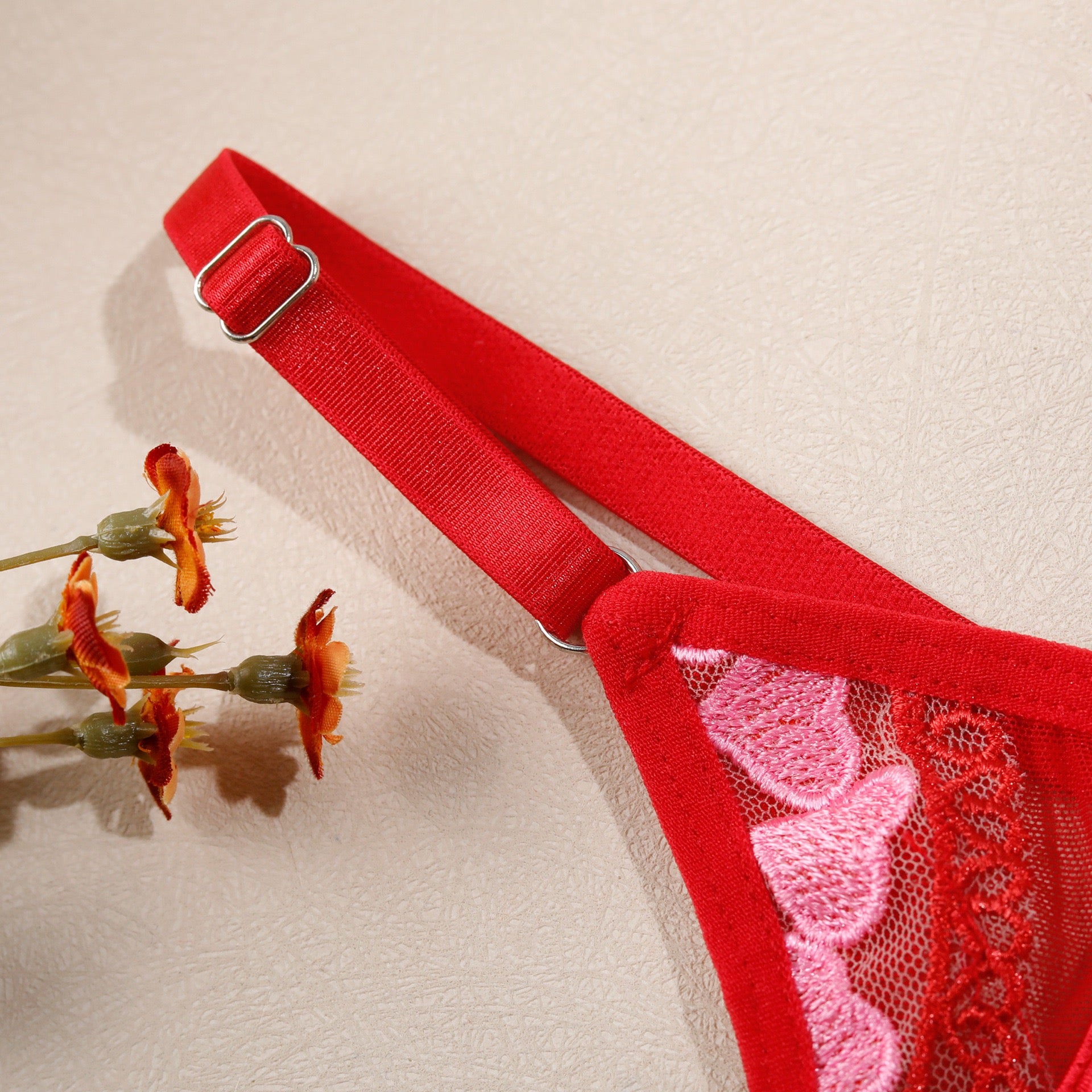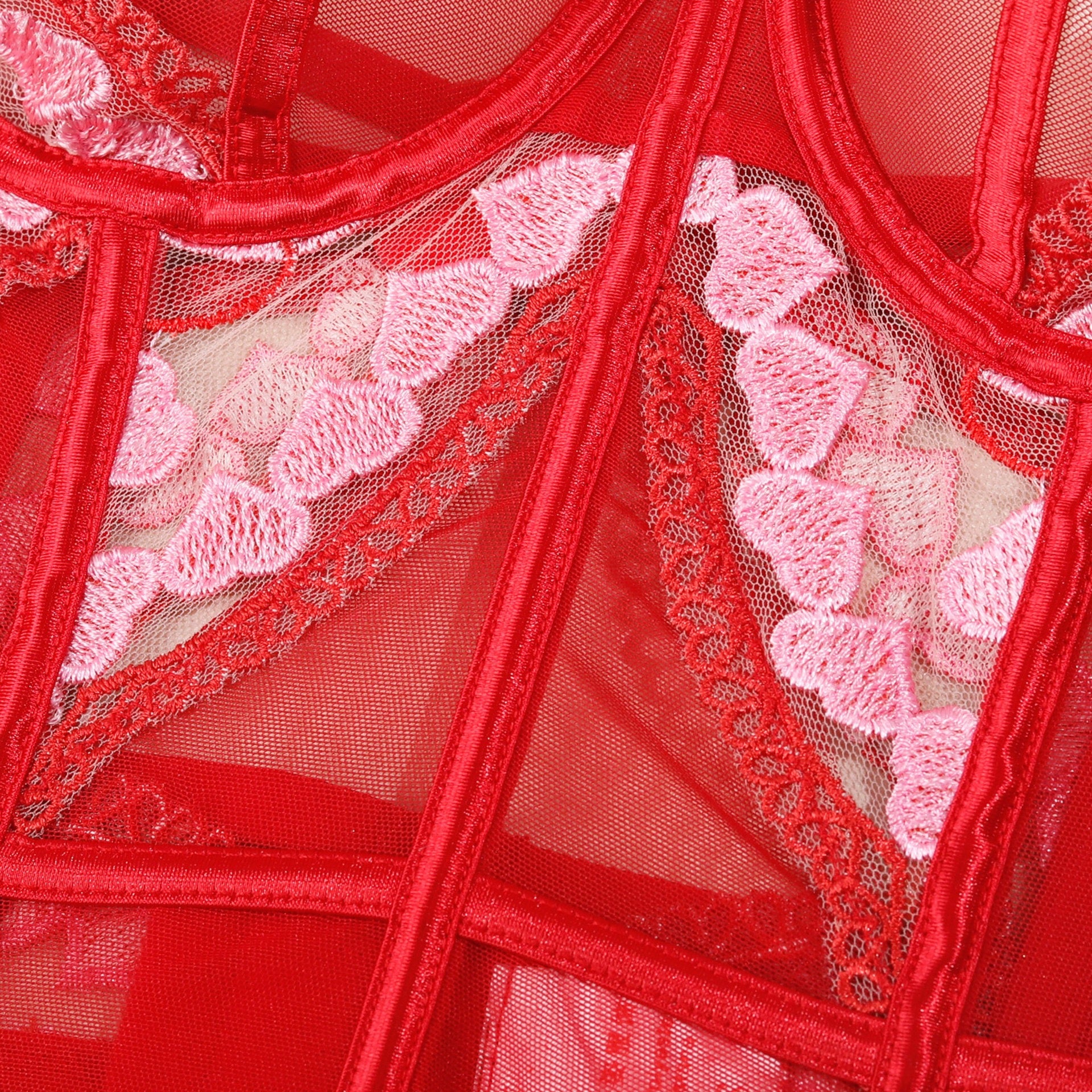 Características: Corset con encaje transparente con bordado de corazones; estilo tanga; ajustable de los tirantes del corset y de los tirantes de la tanga
