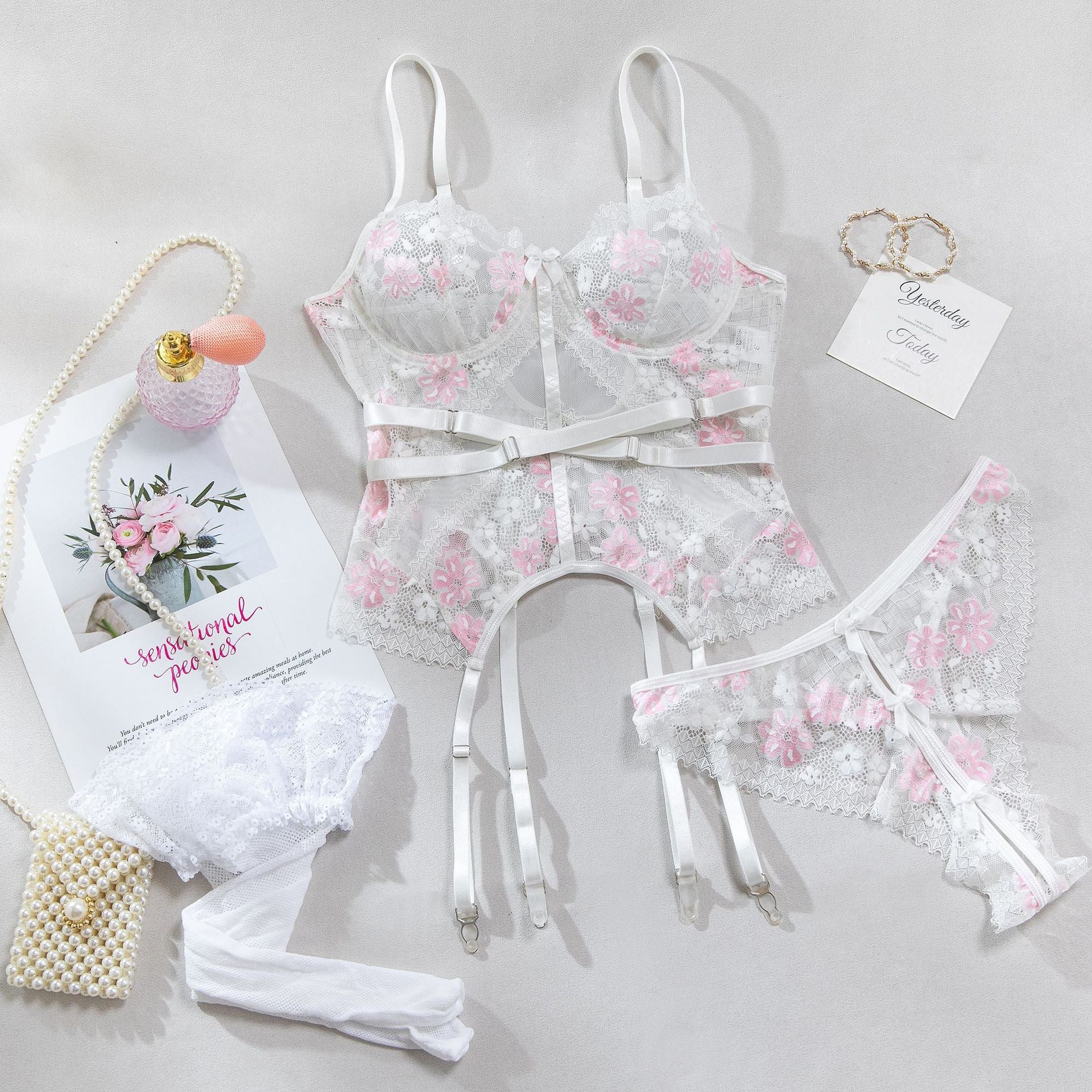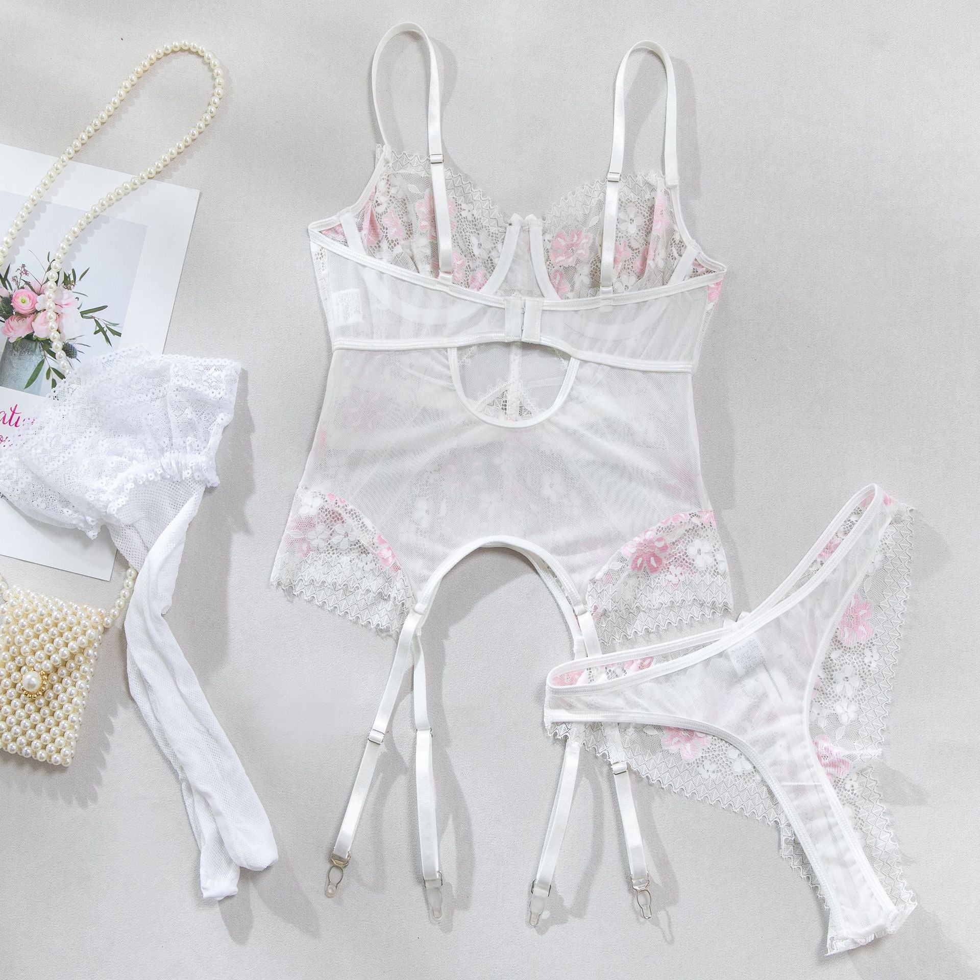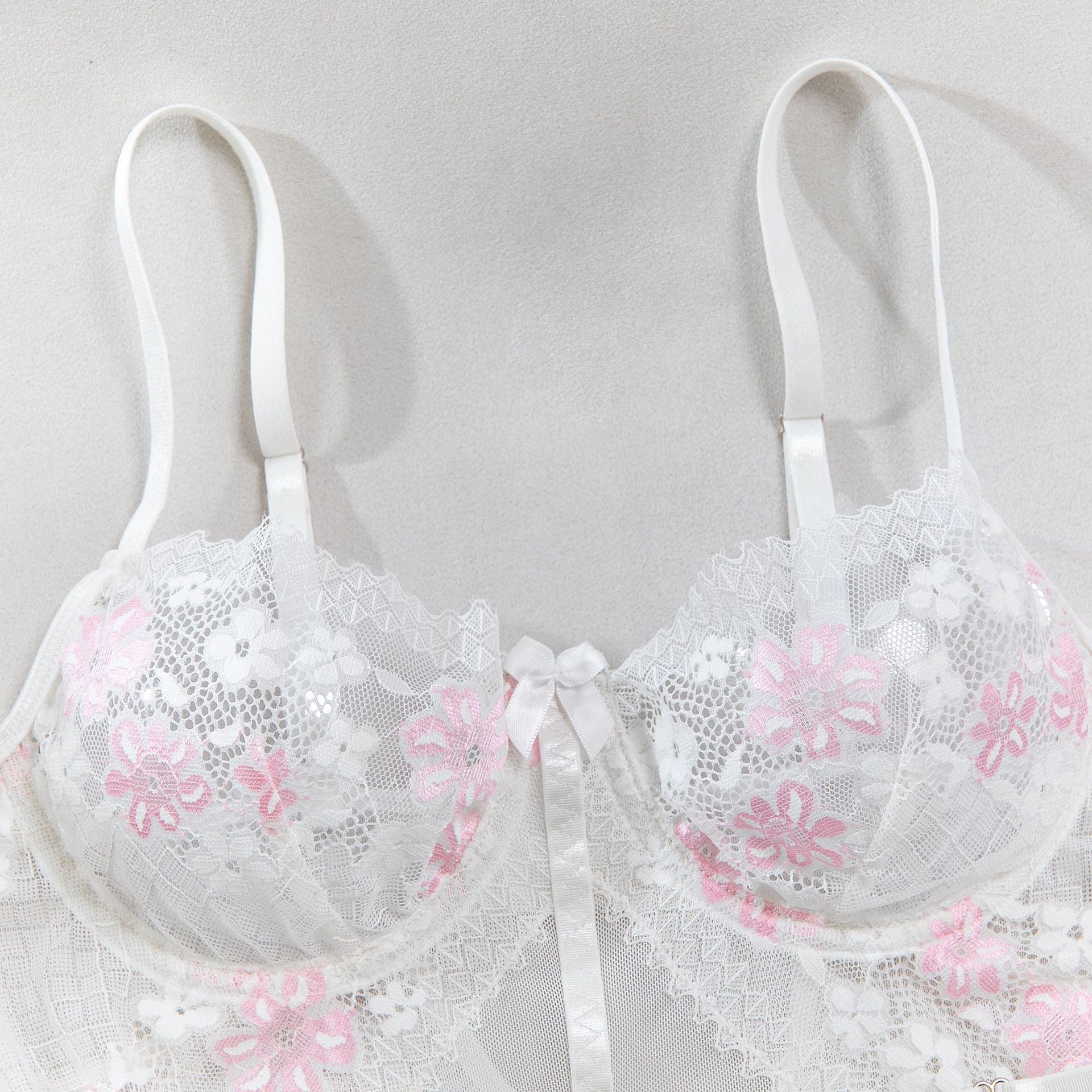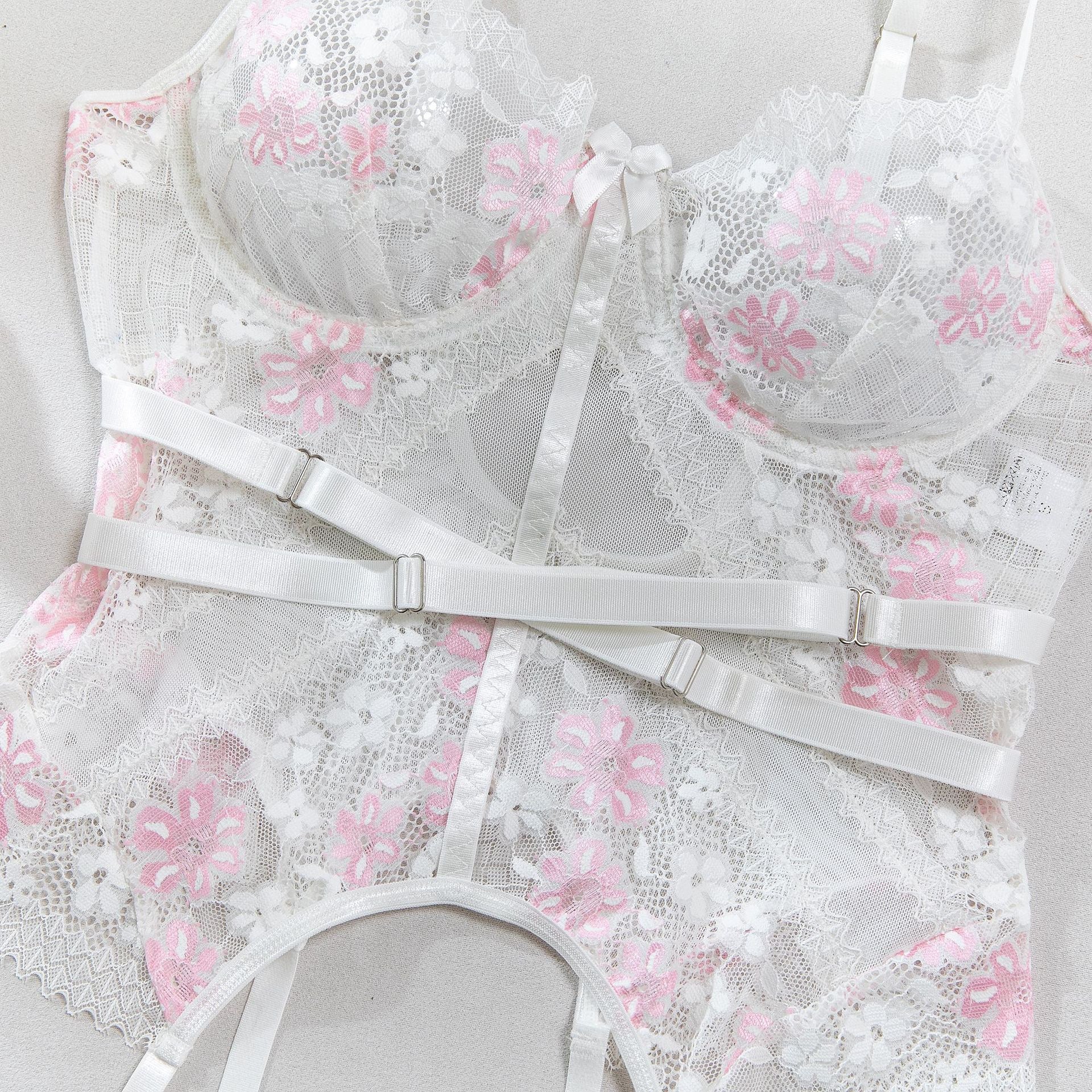 Características: Corset transparente con detalles de delicado bordado floral; liguero incluido; estilo tipo tanga de tiro alto; incluye ballenas en torso para dar mayor soporte; con medias incluidas y tanga con aberturas en la parte inferior