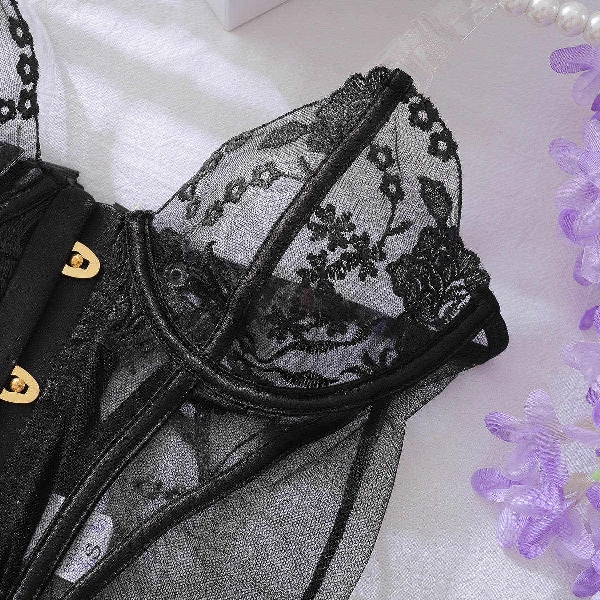 Características: Corset con encaje transparente con bordado floral; medias incluidas; liguero ajustable; con broche en la parte frontal del corset; hilo incluido y ajustable de los tirantes