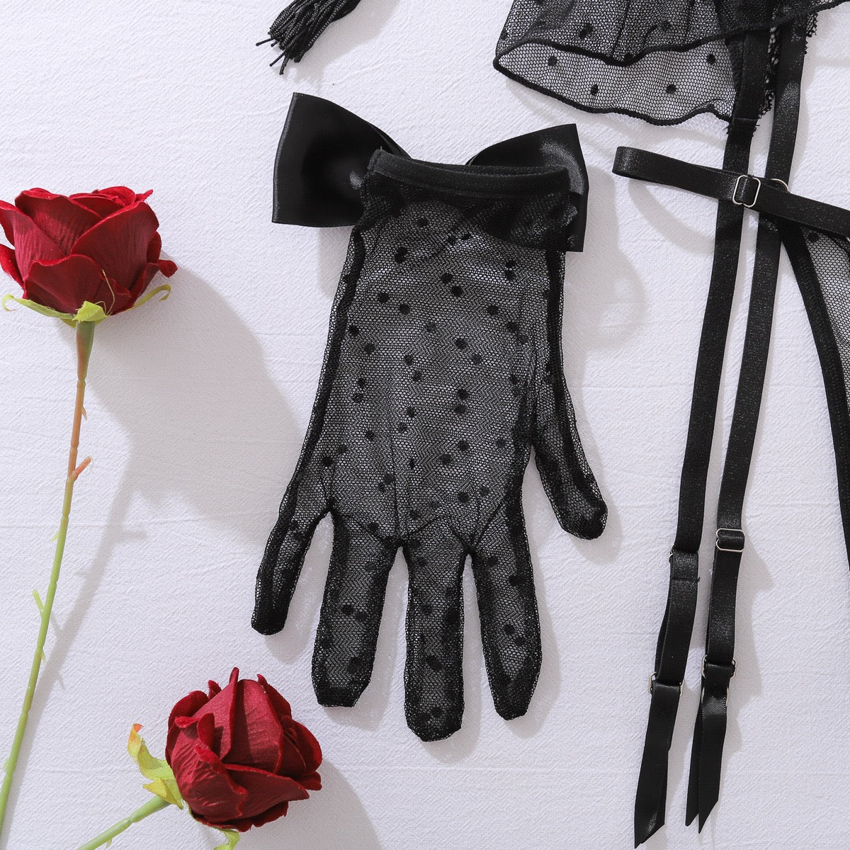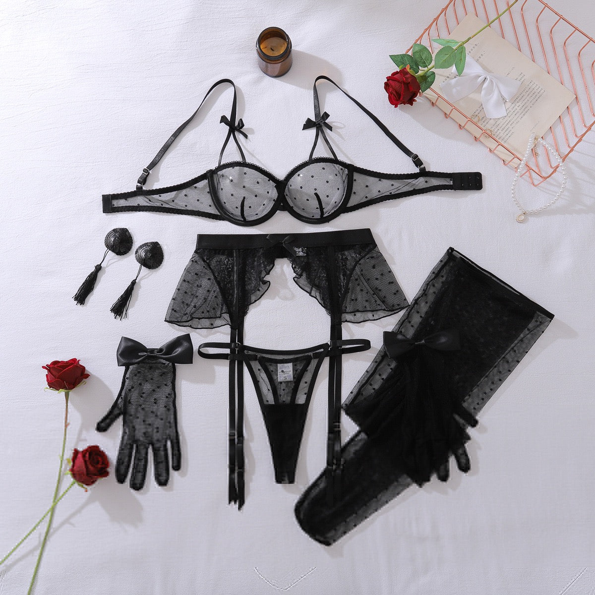 Características: Set con transparencias; suavidad de la tela al tacto; con medias, guantes y cubre pezones decorativos incluidos; tirantes ajustables; estilo tanga; broche ajustable en la parte trasera del brassier