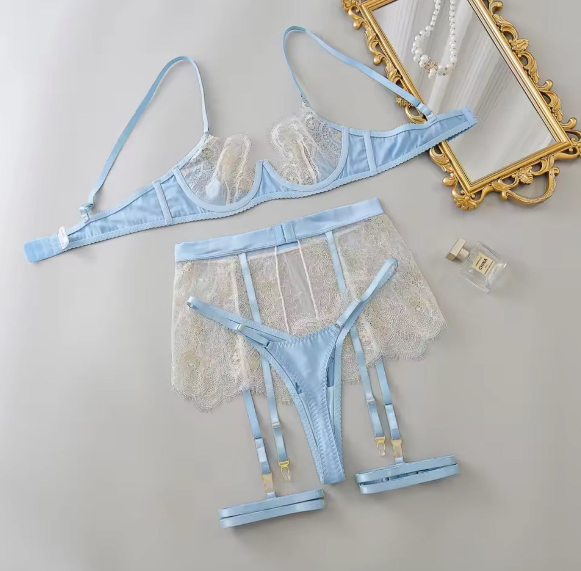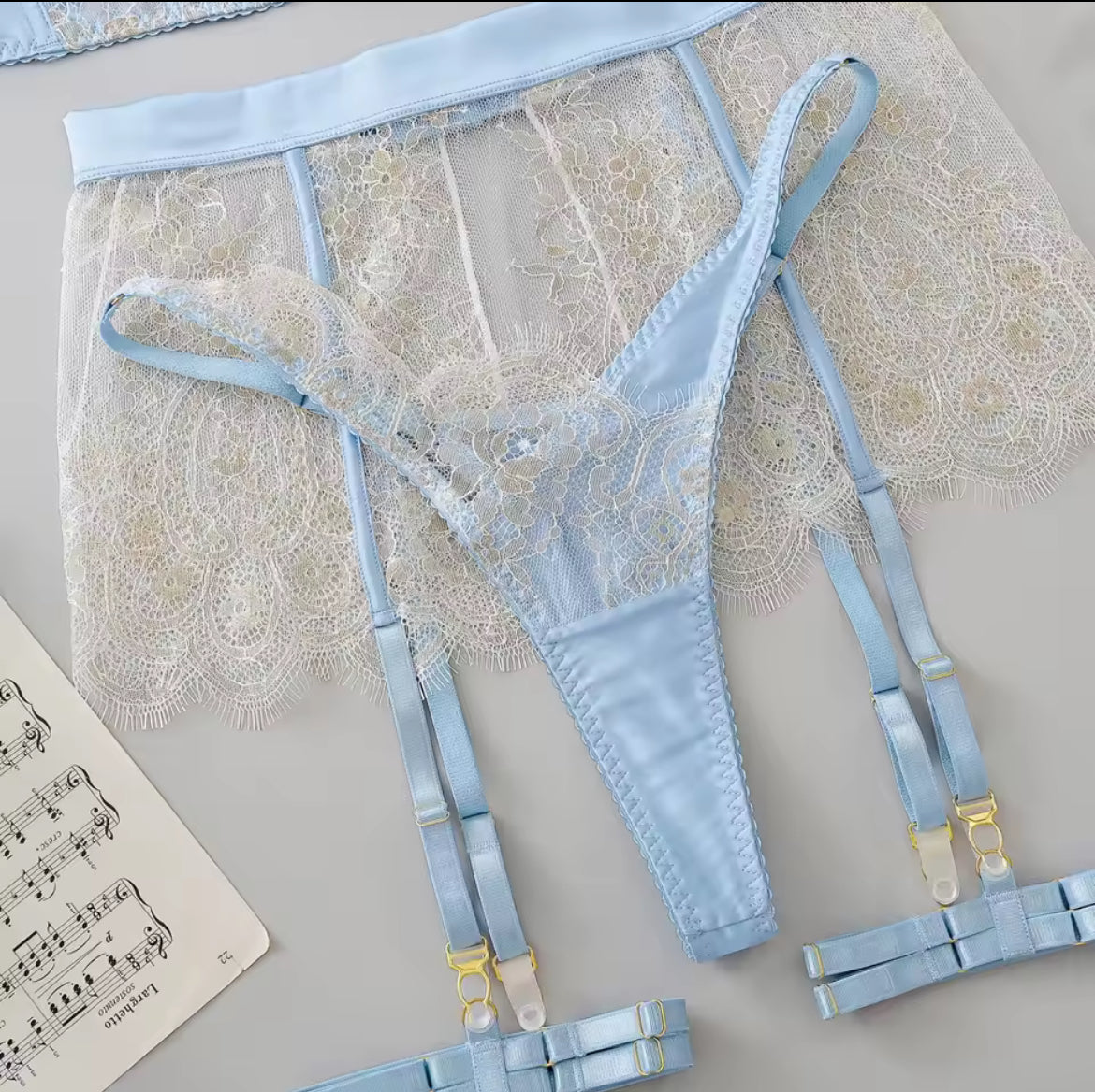 Características: Set con transparencias; suavidad de la tela al tacto; falda incluida; tirantes ajustables; estilo tanga; broche ajustable en la parte trasera del brassier; ligas y liguero incluido