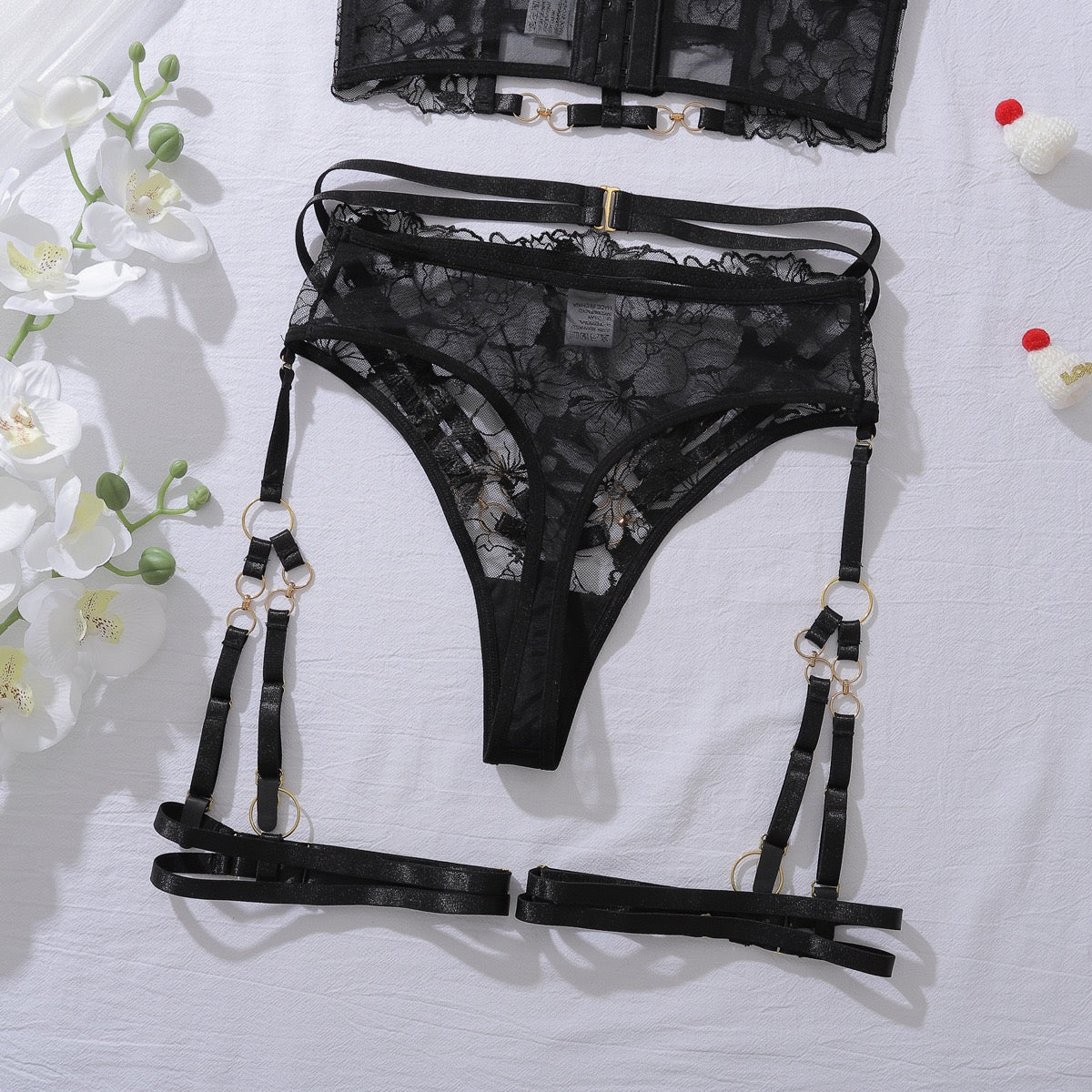 Características: Set con delicado bordado floral transparente; con liguero y ligas incluidas; soporte de aros en busto; suavidad al tacto; estilo tanga tiro alto; broche ajustable en liguero y brassier; liguero enlazado a la tanga