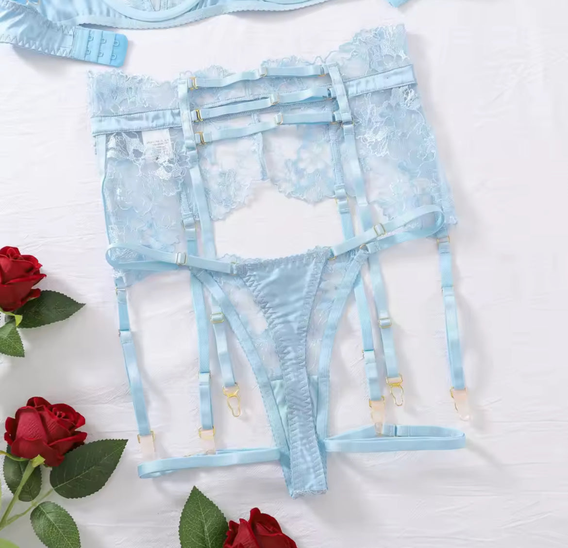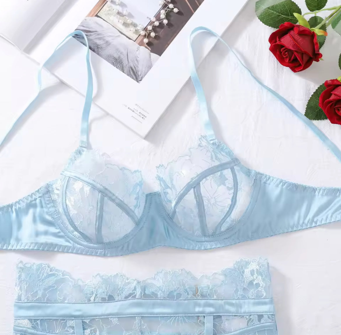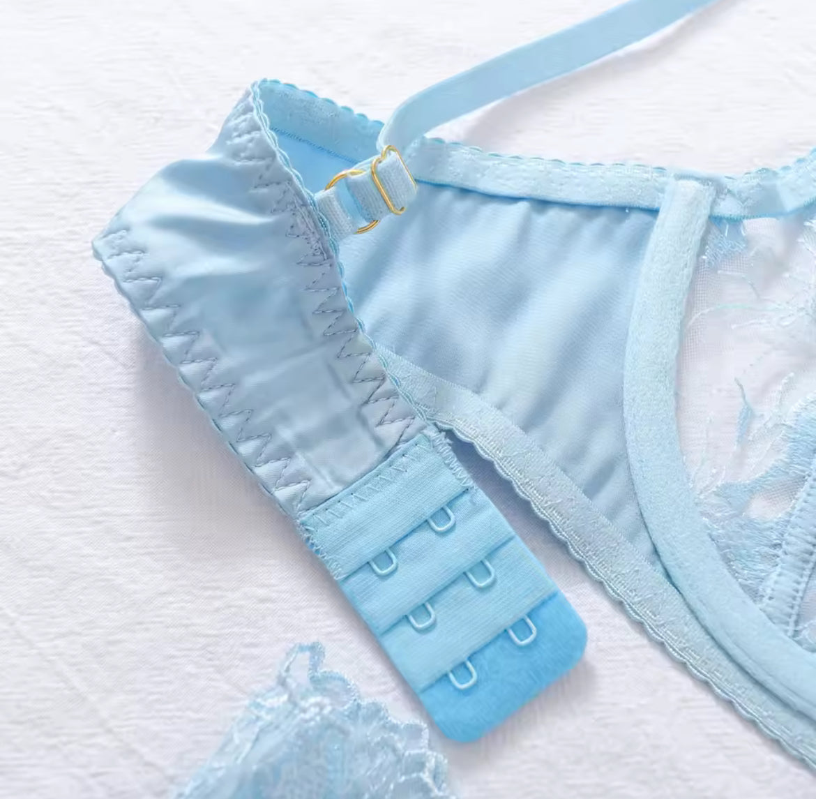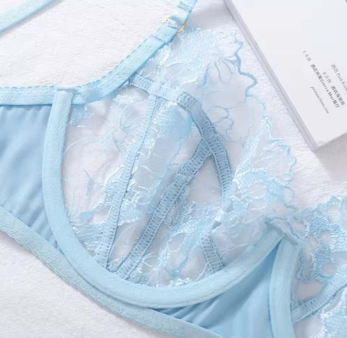 Características: Set con delicado bordado transparente; con liguero y ligas incluidas; broche ajustable en liguero y brassier