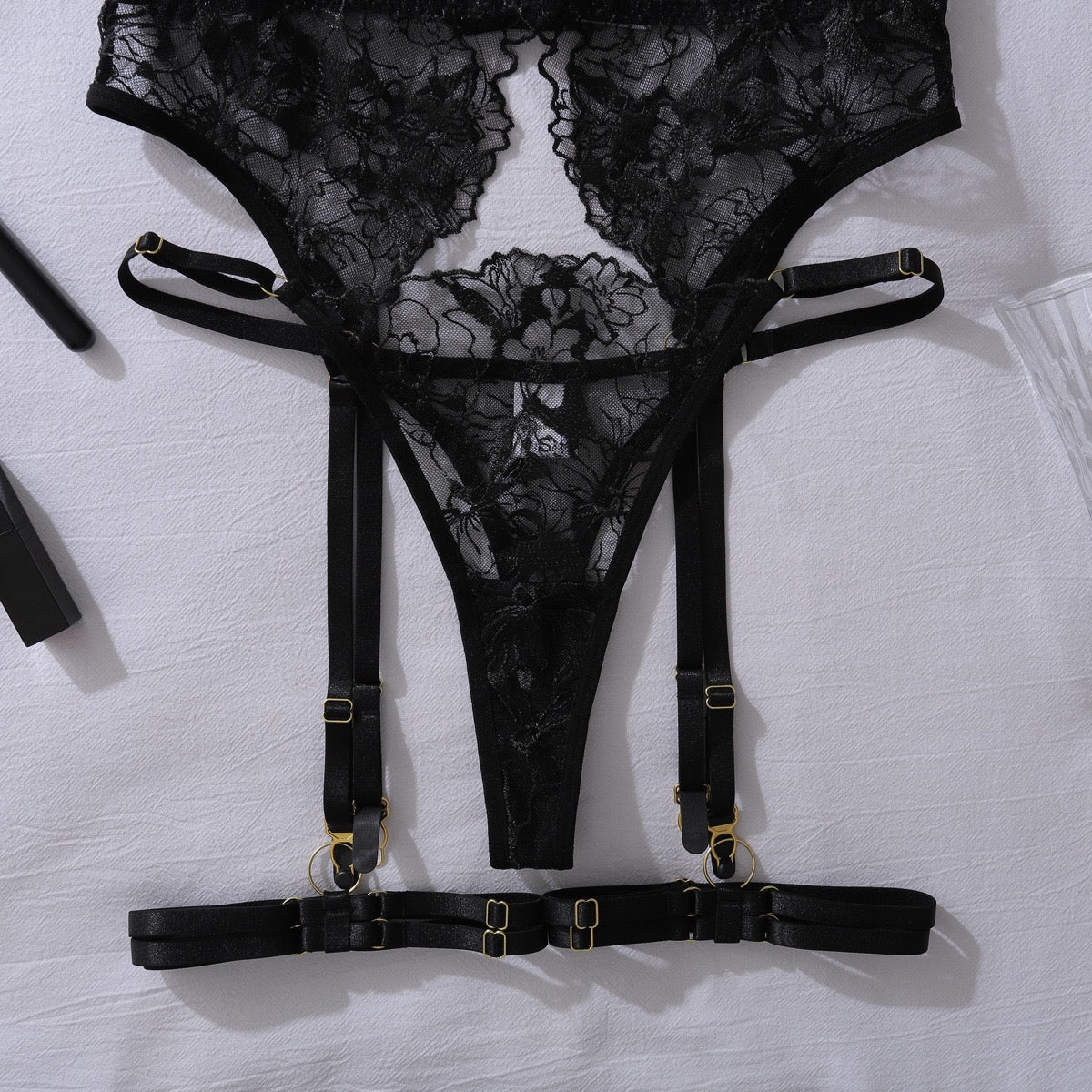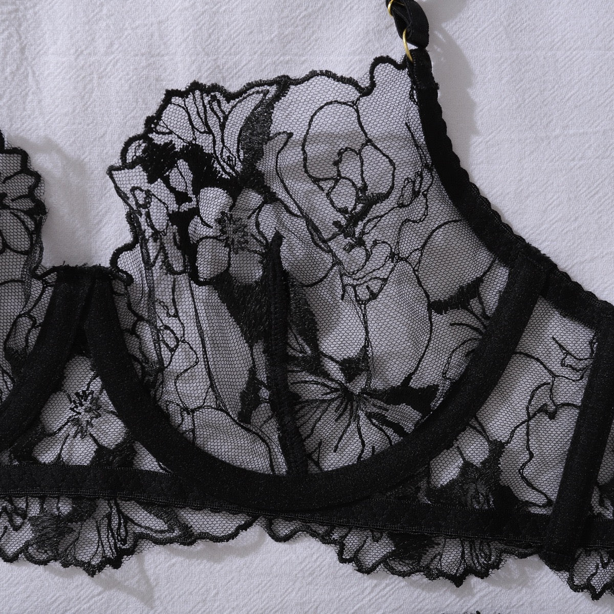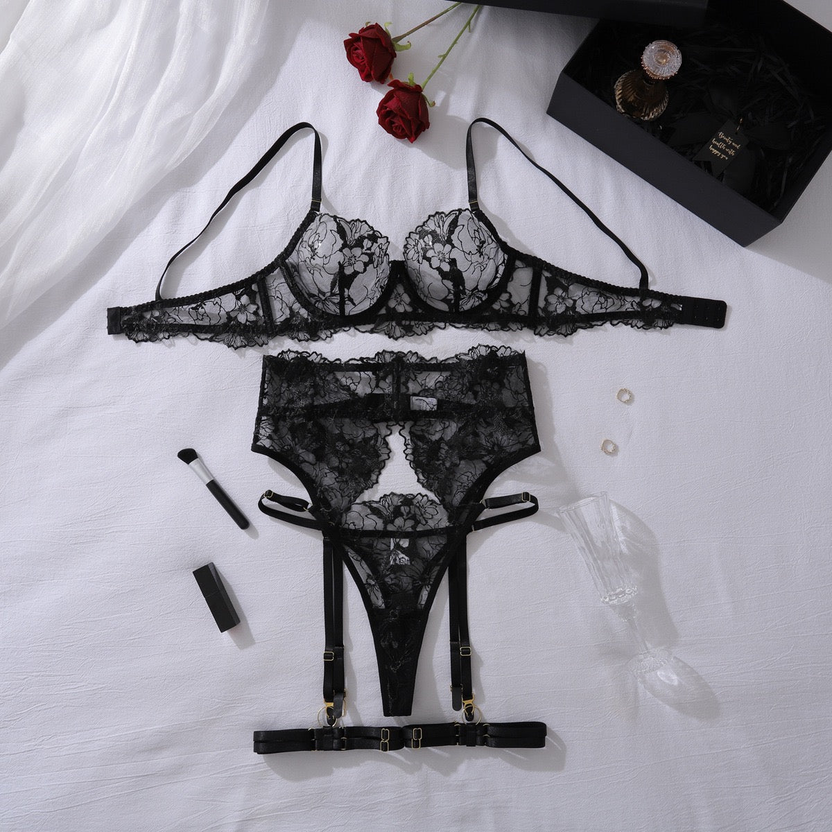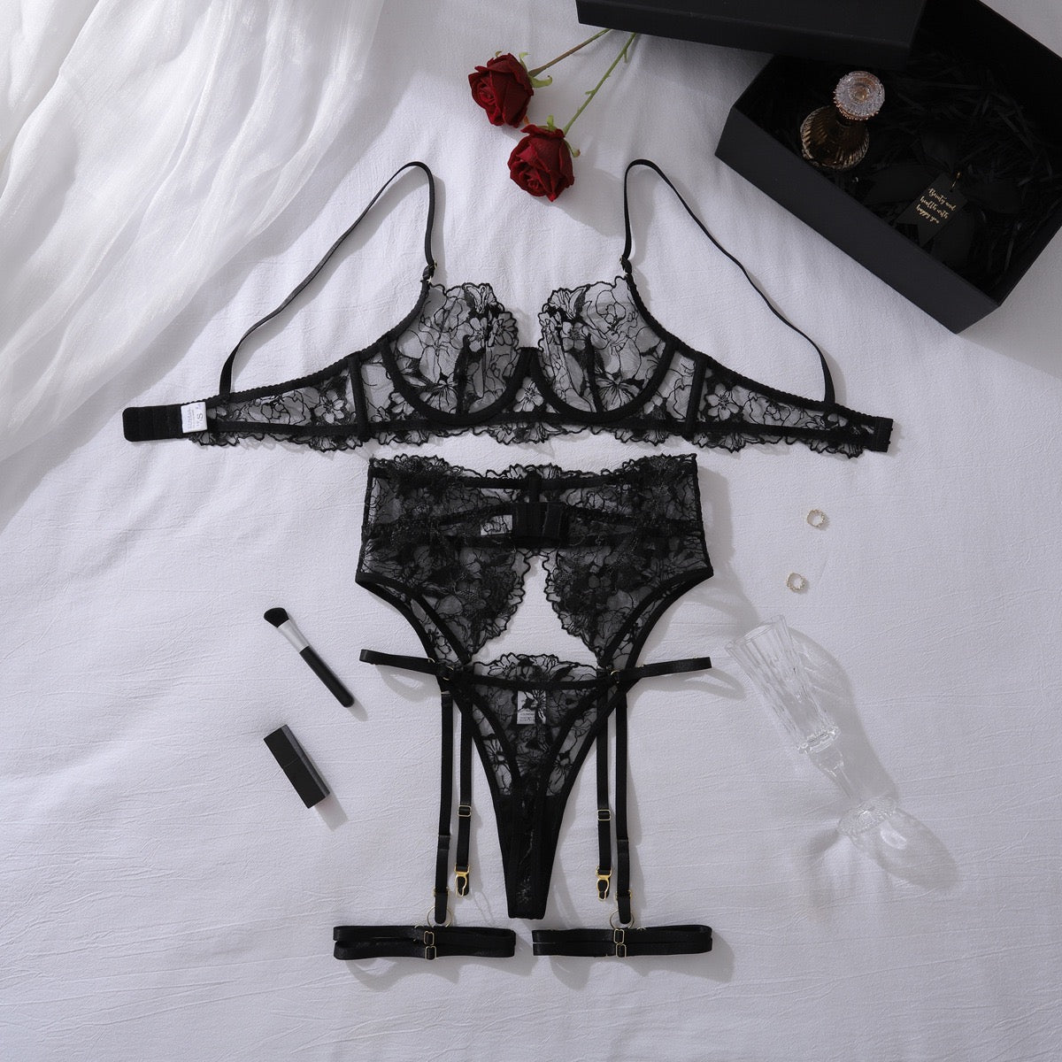 Características: Set con delicado bordado floral transparente; con liguero y ligas incluidas; soporte de aros en busto; suavidad al tacto; estilo tanga; broche ajustable en liguero y brassier