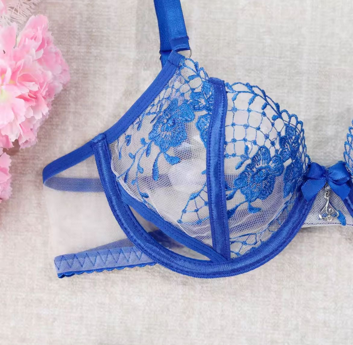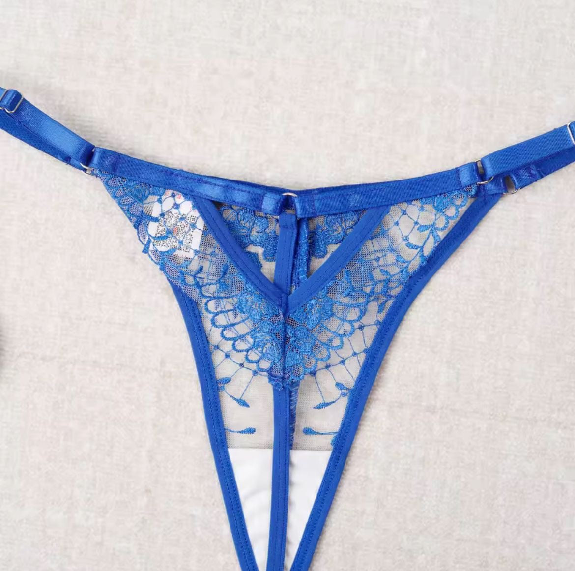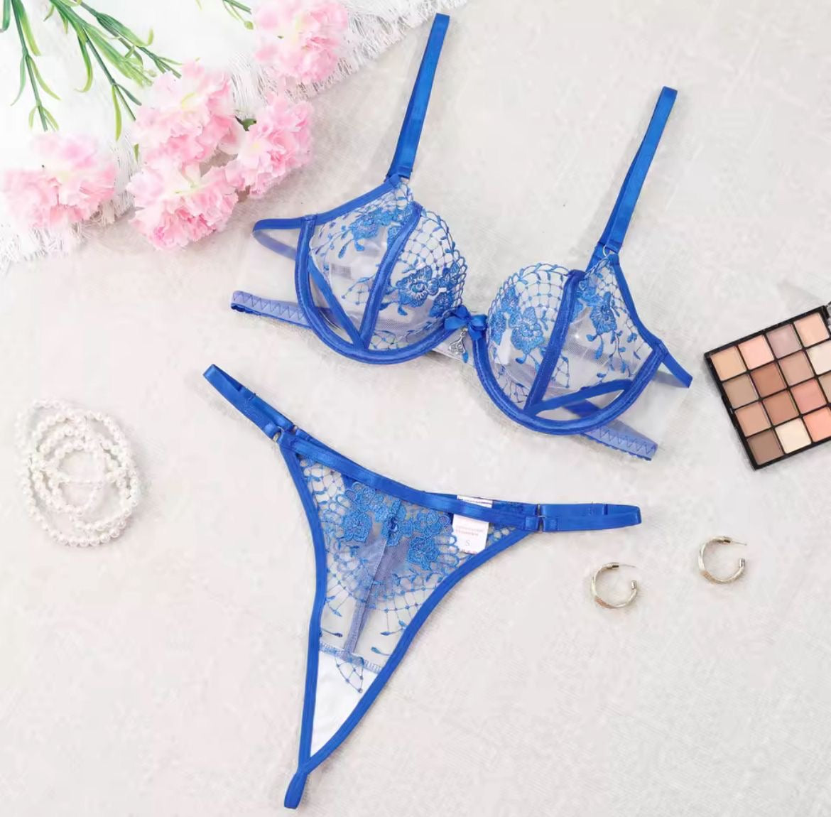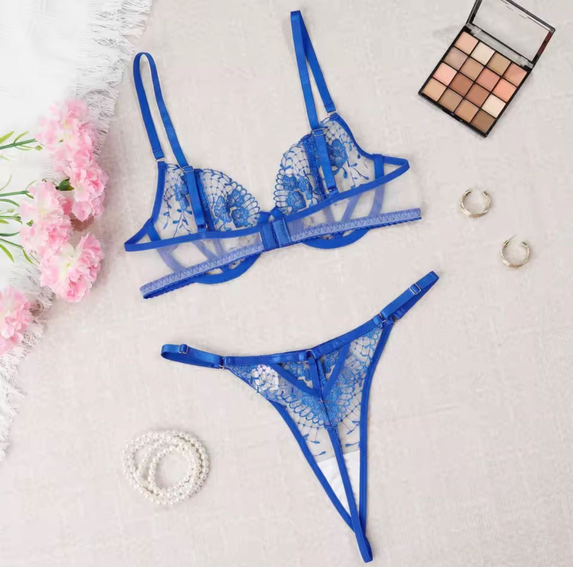 Características: Set con bordado delicado y transparencias; suavidad de la tela al tacto; tirantes ajustables; estilo tanga y broche ajustable en la parte trasera del brassier