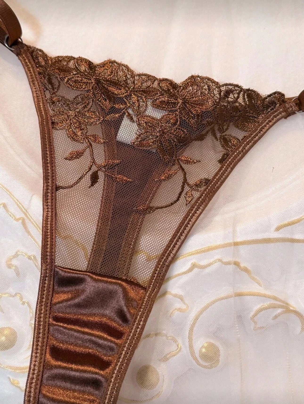 Características: Set con bordado delicado y transparencias; suavidad de la tela al tacto; tirantes ajustables en brassier; tanga ajustable y broche ajustable en la parte trasera del brassier