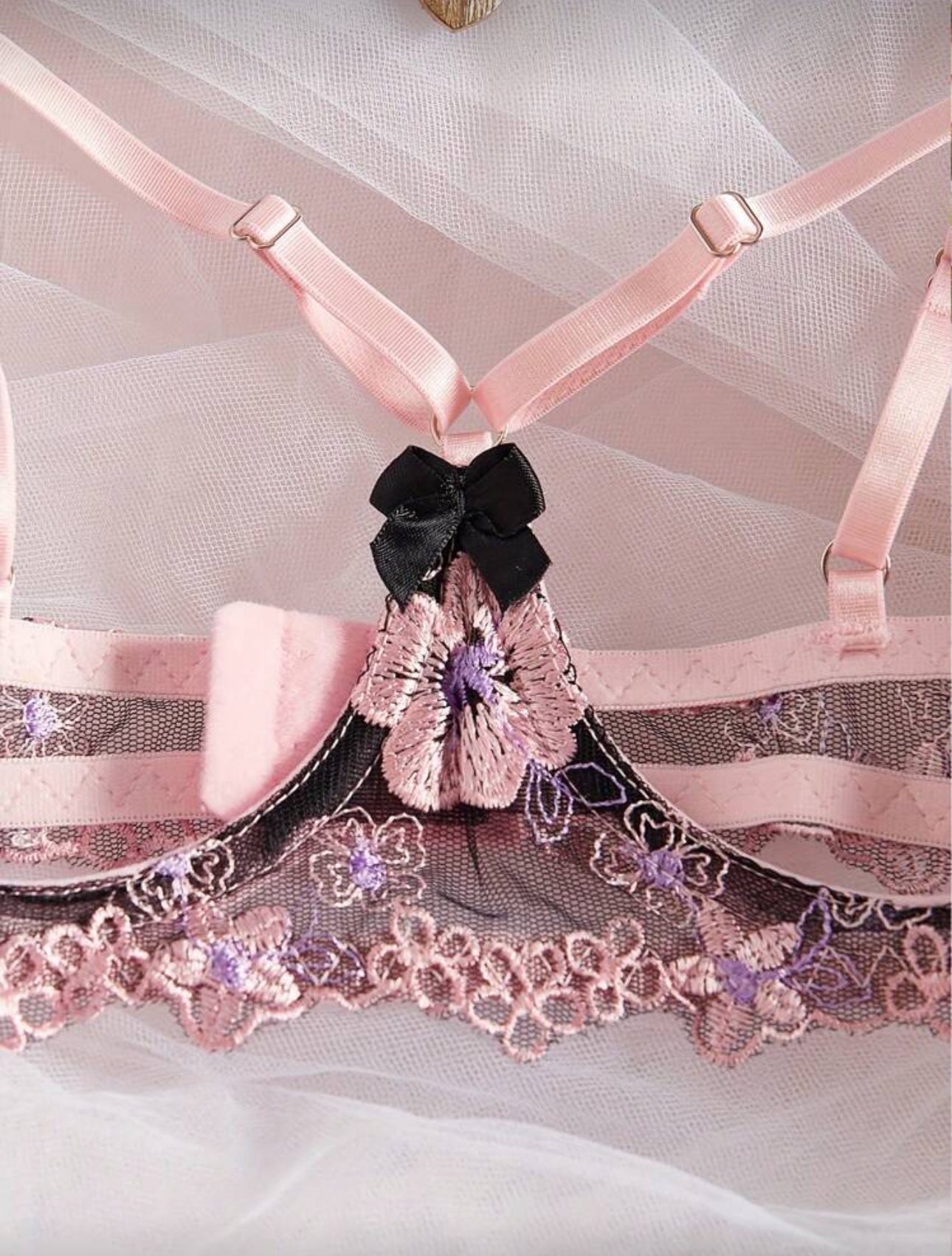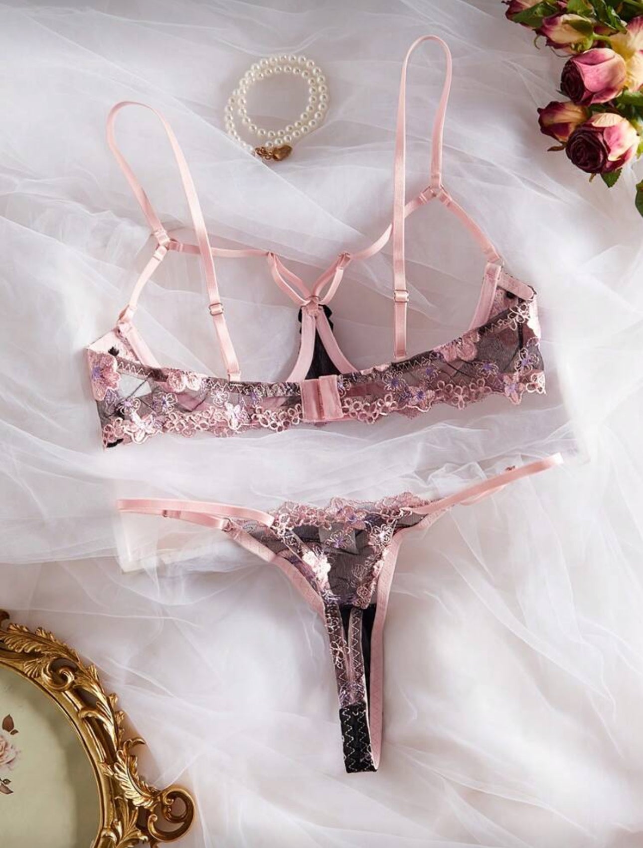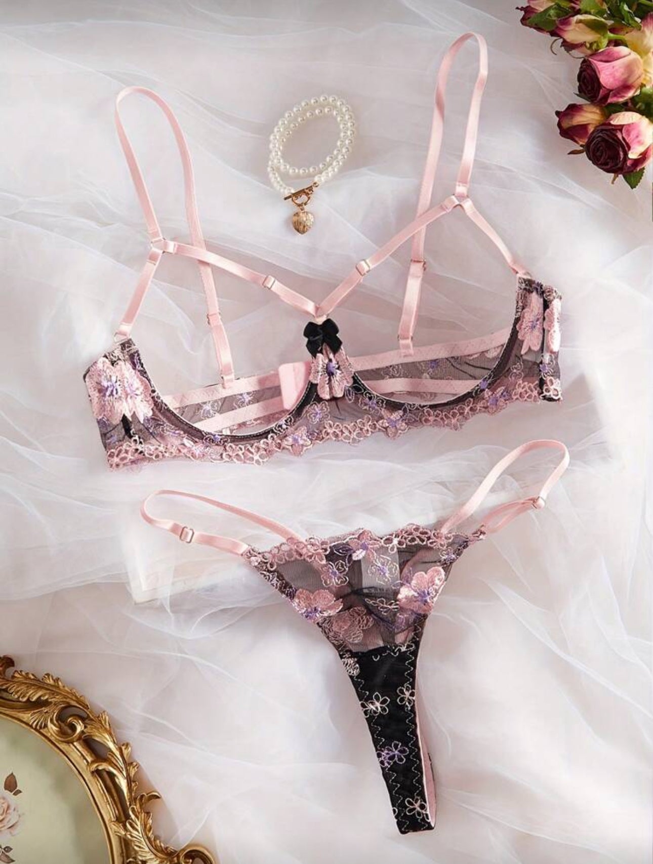 Características: Set con transparencias y aberturas; suavidad de la tela al tacto; tirantes ajustables; estilo tanga y broche ajustable en la parte trasera del brassier; abertura en busto