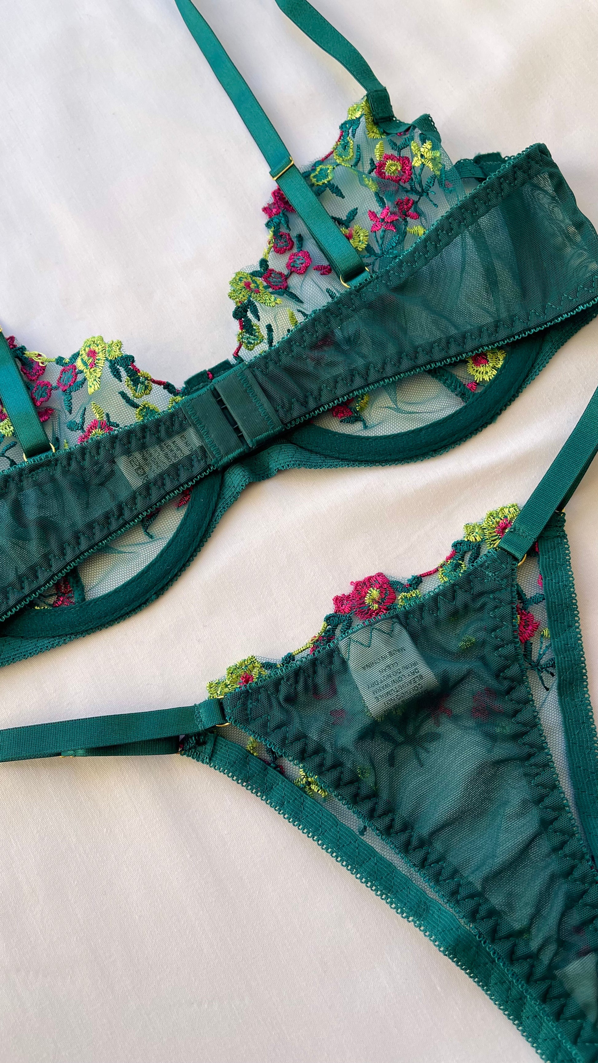 Características: Set con bordado delicado floral y transparencias; suavidad de la tela al tacto; tirantes ajustables; estilo tanga y broche ajustable en la parte trasera del brassier