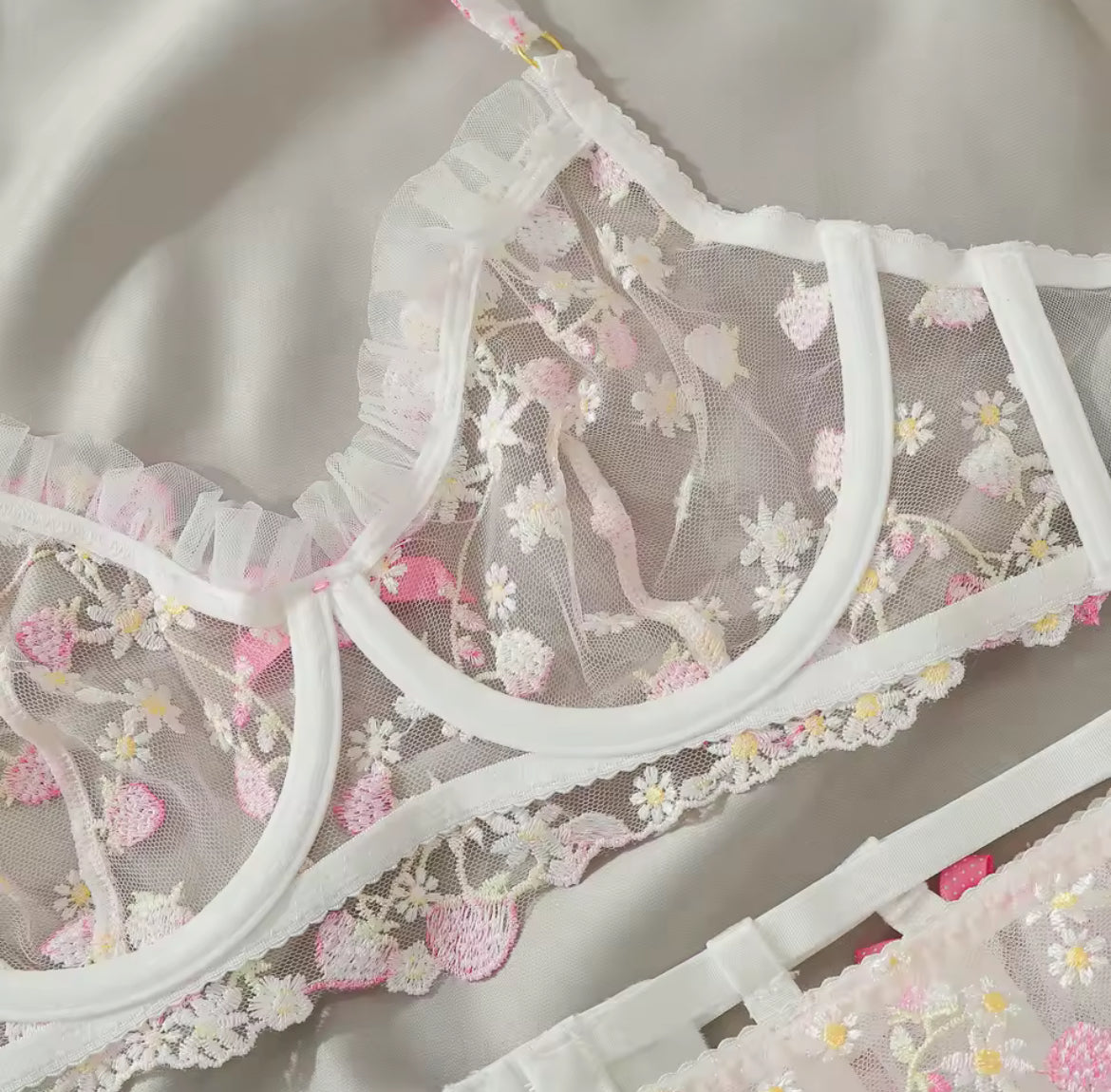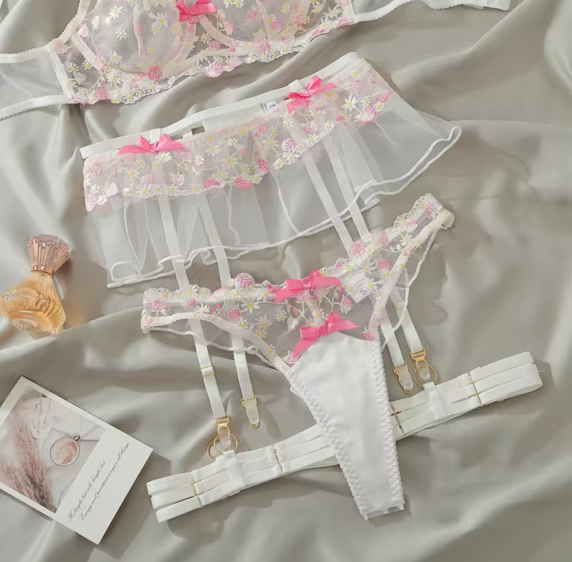 Características: Set transparente con detalles de delicado bordado floral; liguero incluido; estilo tipo tanga de tiro alto; incluye ballenas en torso para dar mayor soporte; con ligas incluidas; revuelos en liguero y tirantes de brassier