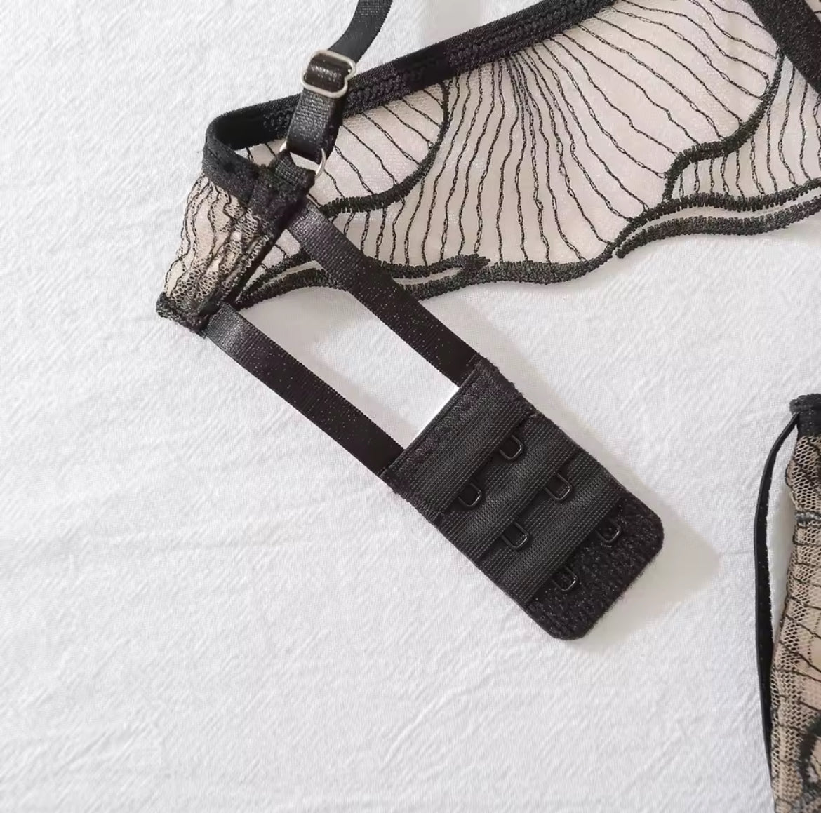 Características: Set con transparencias; suavidad de la tela al tacto; tirantes ajustables; estilo tanga; broche ajustable en la parte trasera del brassier; ligas y liguero incluido