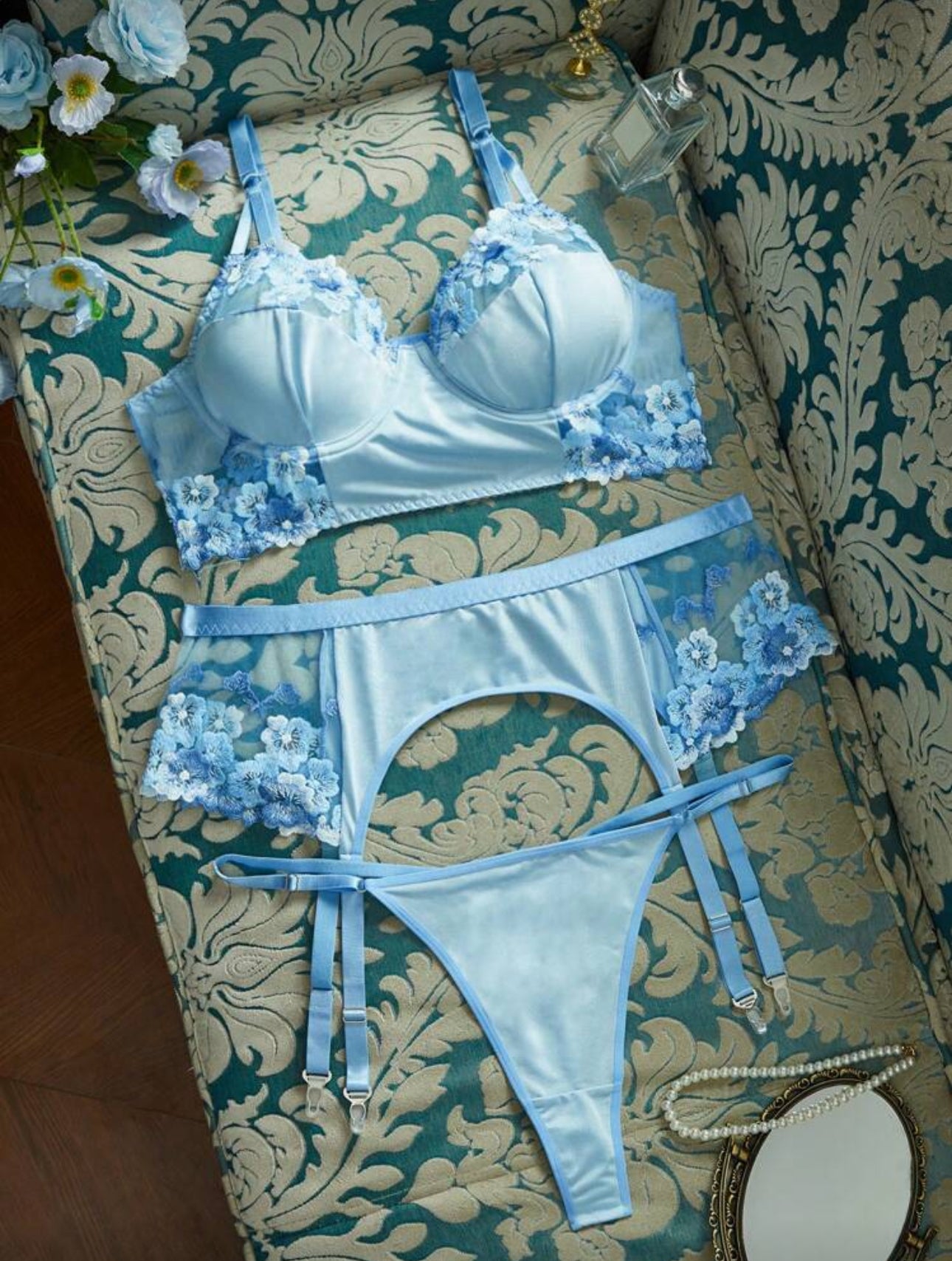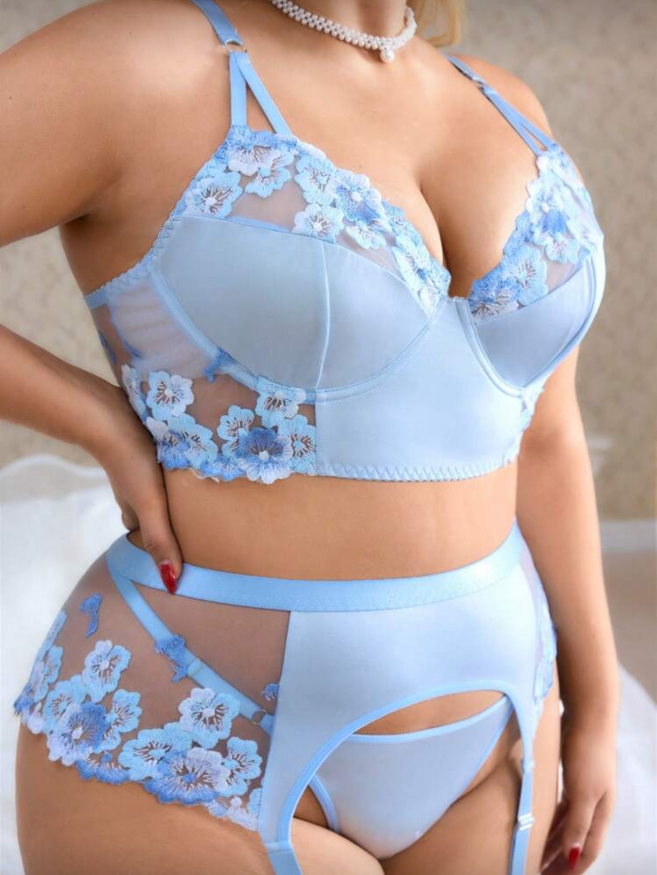 Características: Set con delicado bordado transparente; con liguero y medias incluidas y broche ajustable en liguero y brassier