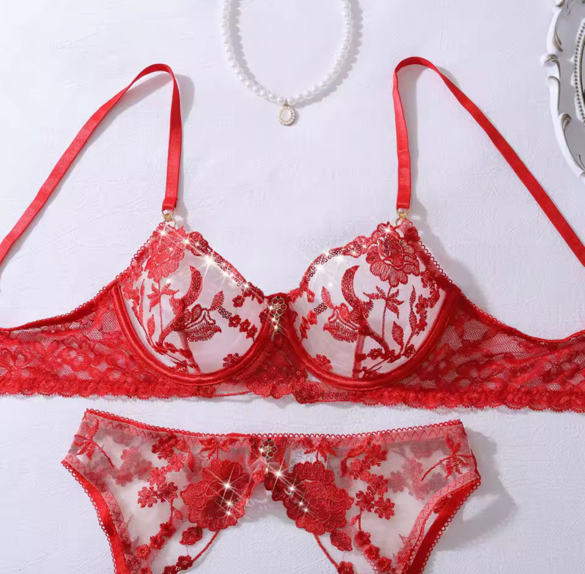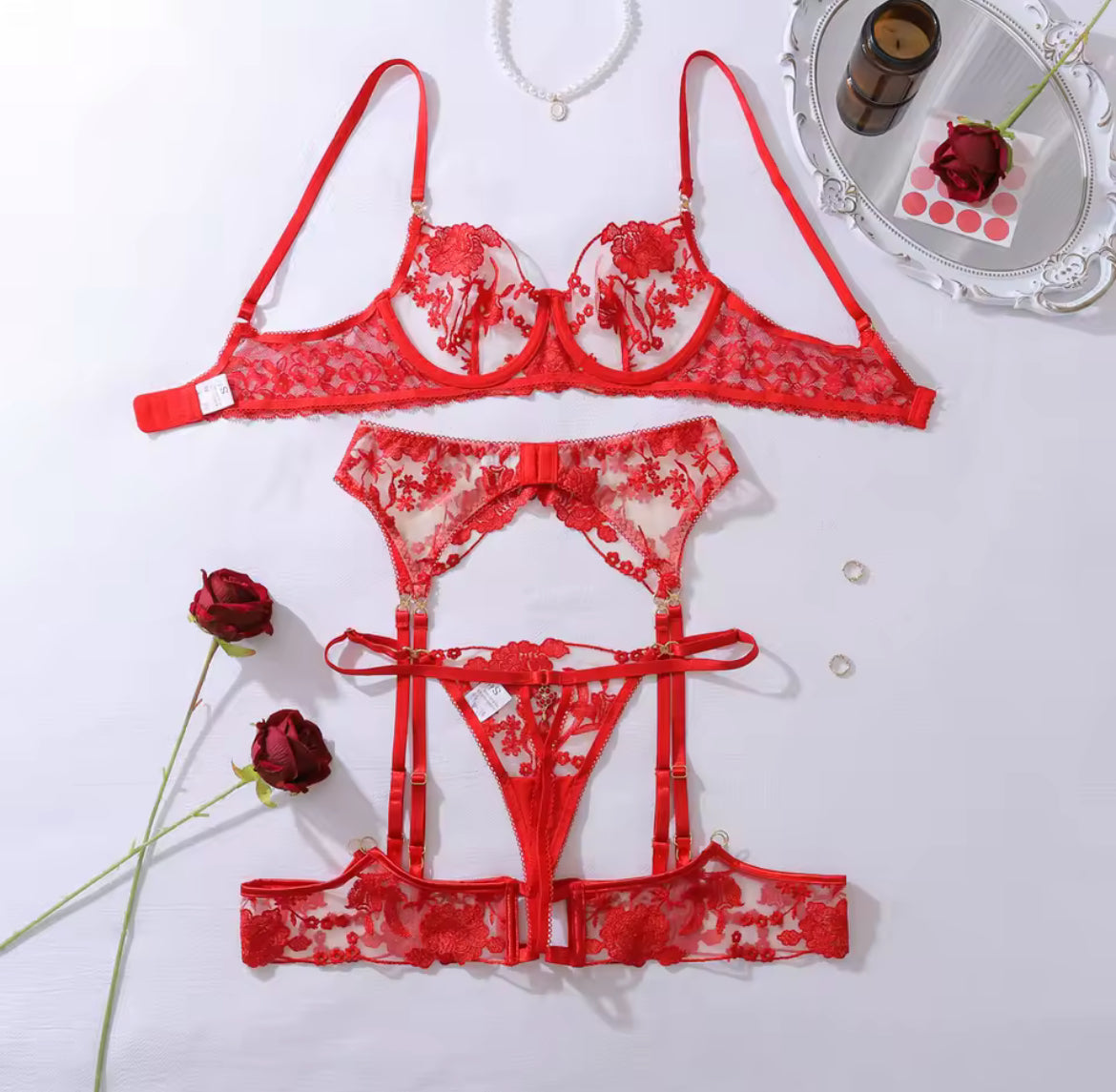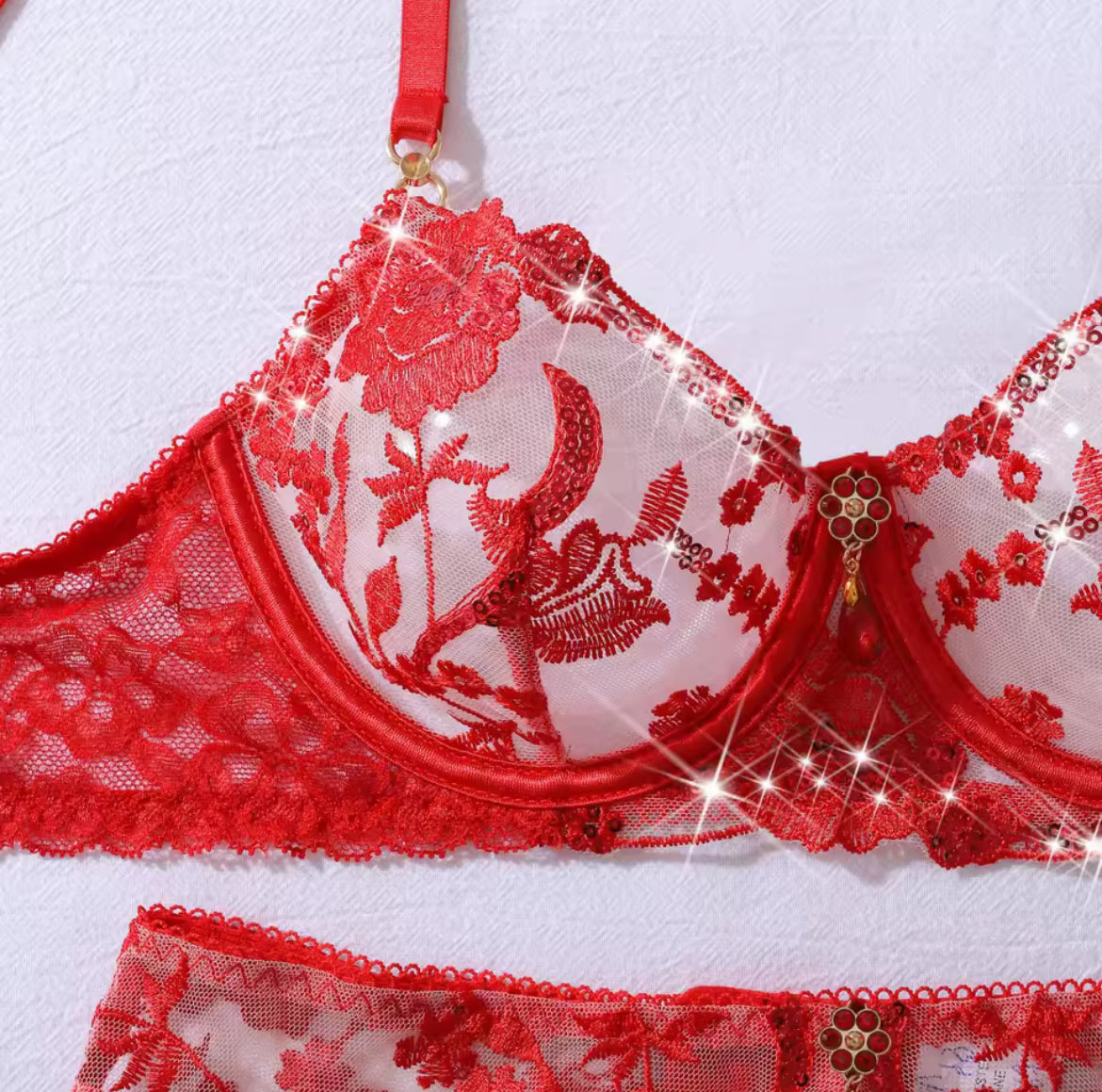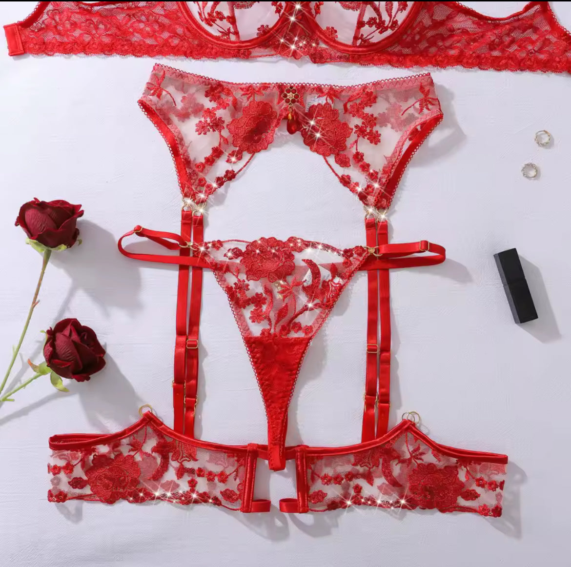 Características: Set con transparencias; suavidad de la tela al tacto; tirantes ajustables; estilo tanga; broche ajustable en la parte trasera del brassier; detalles de brillos en todo el set; ligas y liguero incluido