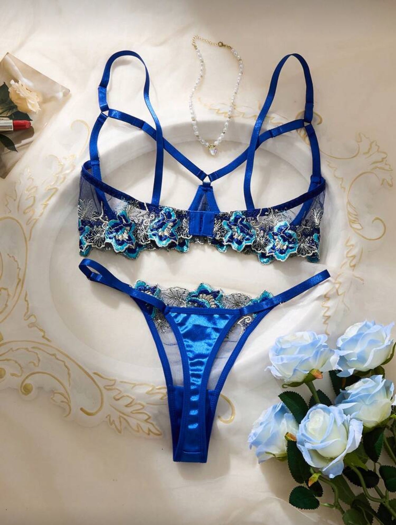 Características: Set con transparencias y aberturas; suavidad de la tela al tacto; tirantes ajustables; estilo tanga y broche ajustable en la parte trasera del brassier; abertura en busto