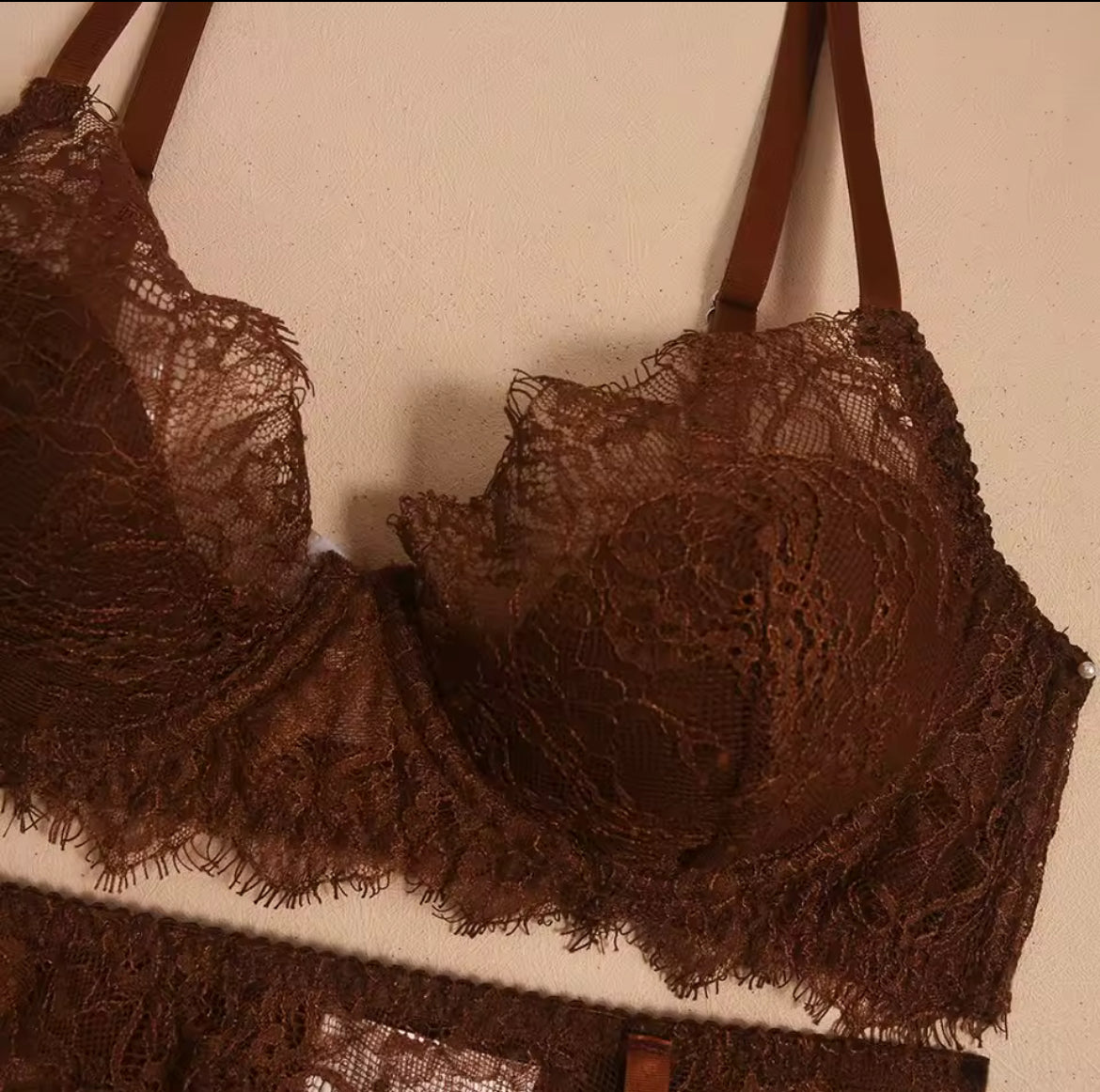 Características: Set con transparencias; suavidad de la tela al tacto; tirantes ajustables; estilo tanga; broche ajustable en la parte trasera del brassier; ligas y liguero incluido
