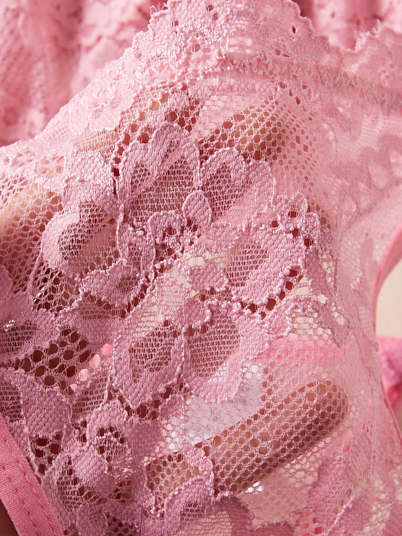 Características: Set con encaje floral transparente; falda holgada con liguero; ligas incluidas; liguero ajustable; tanga incluido y ajustable de los tirantes en brassier