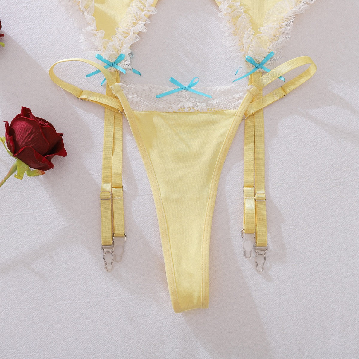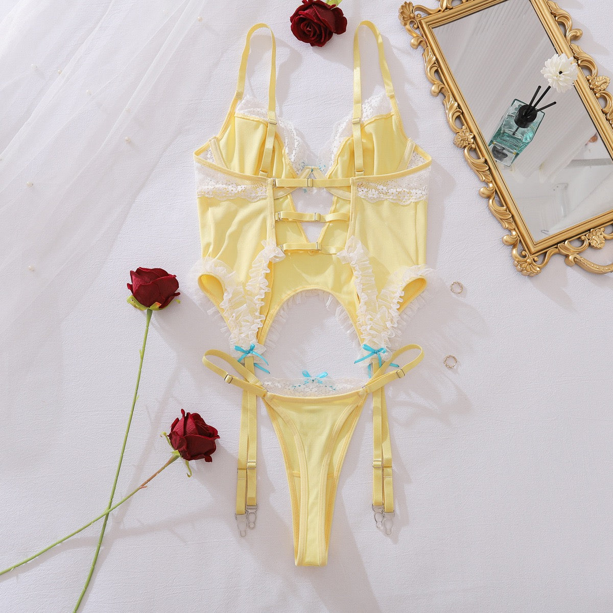 Características: Corset con encaje transparente y pequeños revuelos en corset; liguero ajustable; corset con ballena; ajustable de los tirantes y tanga